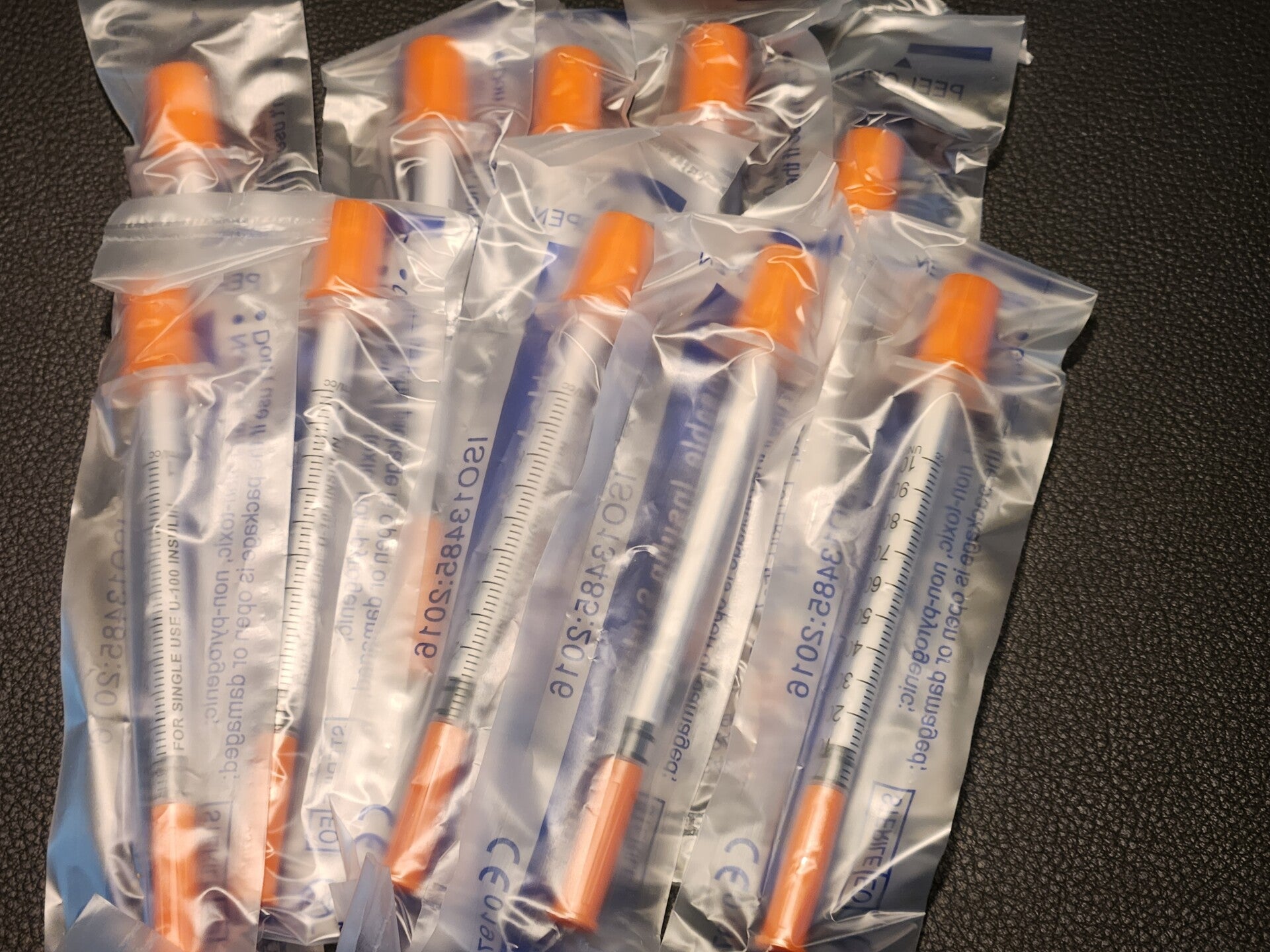 .3, .5 or 1 ml - 31 ga. Used for injections or reconstitution.