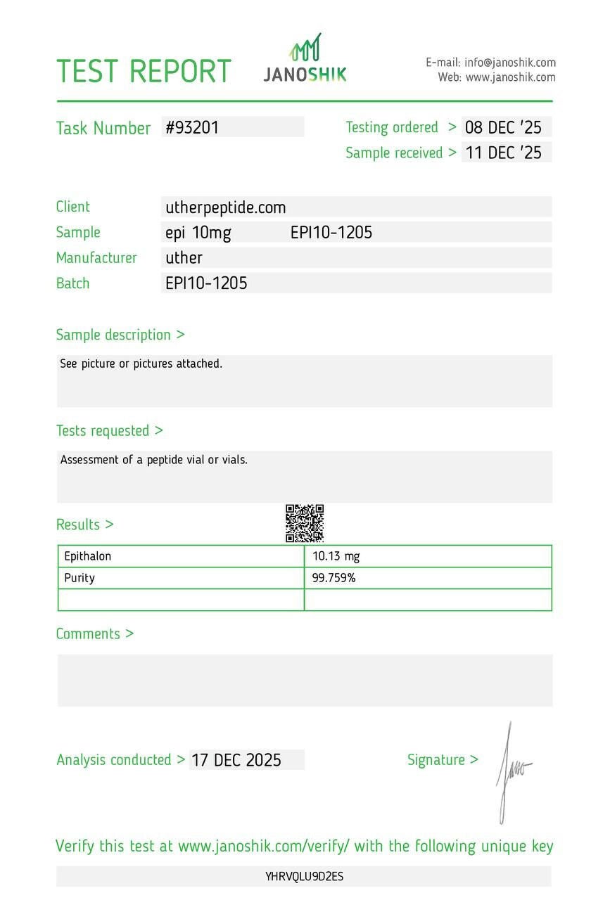 Epitalon (10mg) is a synthetic tetrapeptide studied for its potential in promoting longevity, regulating sleep, and supporting cellular repair through telomere activation.